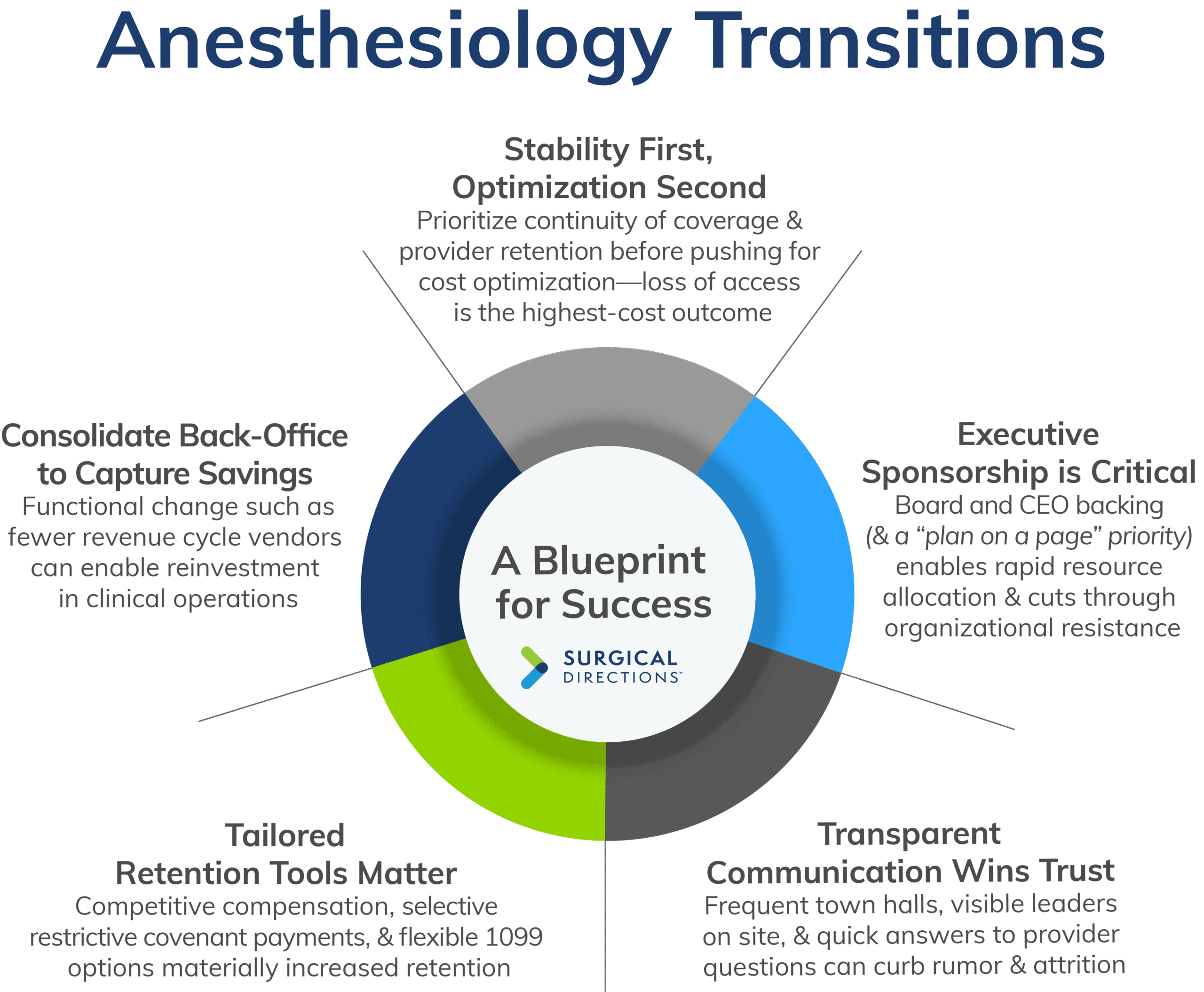 Anesthesiology transitions are complex. Surgical Directions’ proven methods drive results and are customized for implementations that meet your needs. To learn more, read the Piedmont Healthcare System’s transition case study Stabilizing Anesthesiology at Scale
