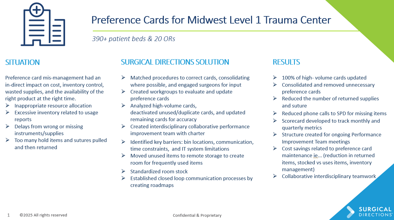 A 390+ bed, 20-OR trauma center tackled preference card chaos—standardizing stock, updating high-volume cards, and aligning surgeons and SPD. The result: fewer returns and calls, faster room readiness, cleaner inventory, and measurable cost savings driven by a new interdisciplinary performance model.